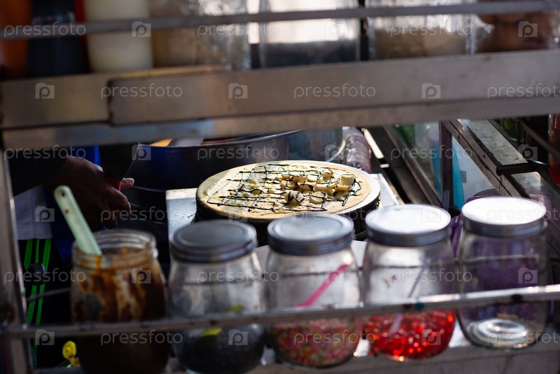 Процесс приготовления уличной еды, блинов с бананами и шоколадом