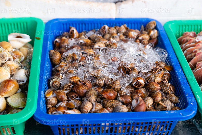 Свежие улитки на традиционном рынке свежих морепродуктов, Таиланд