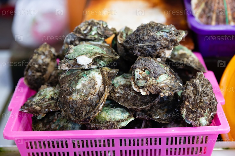 Свежие устрицы на традиционном рынке свежих морепродуктов, Таиланд