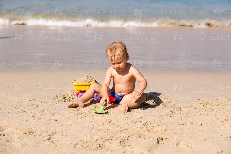 Маленький мальчик играет на песке у моря с лопатой и машинкой