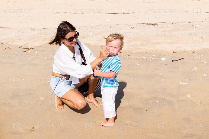 Мать наносит солнцезащитный крем на лицо ребенка. Защита от солнечных ожогов. Летние каникулы и концепция отпуска