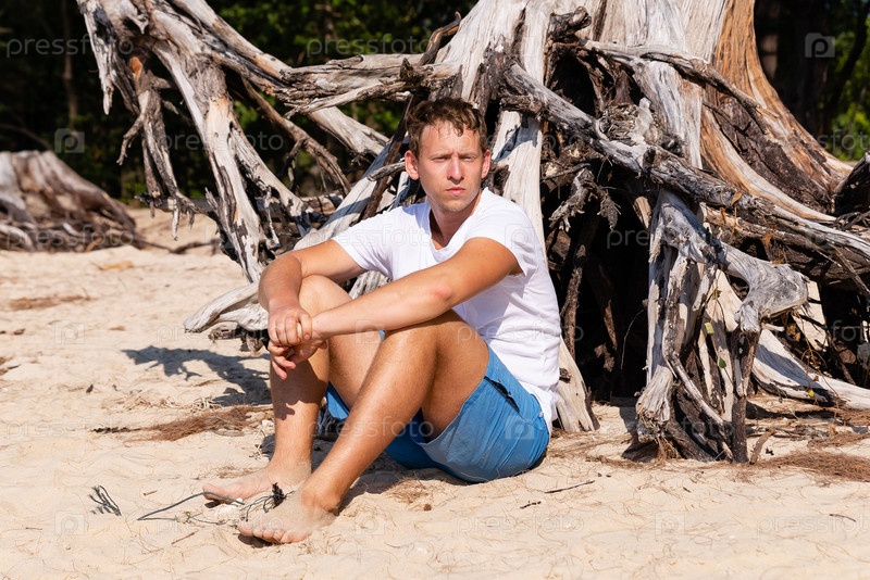 Мужчина сидит на морском песке возле пня