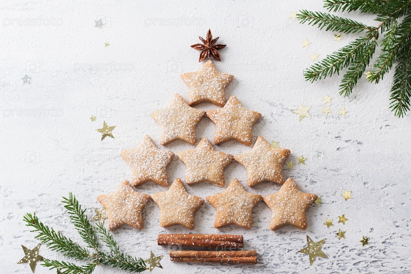 Новогодняя елка из домашних пряников в форме звезд на светло-голубом фоне, вид сверху