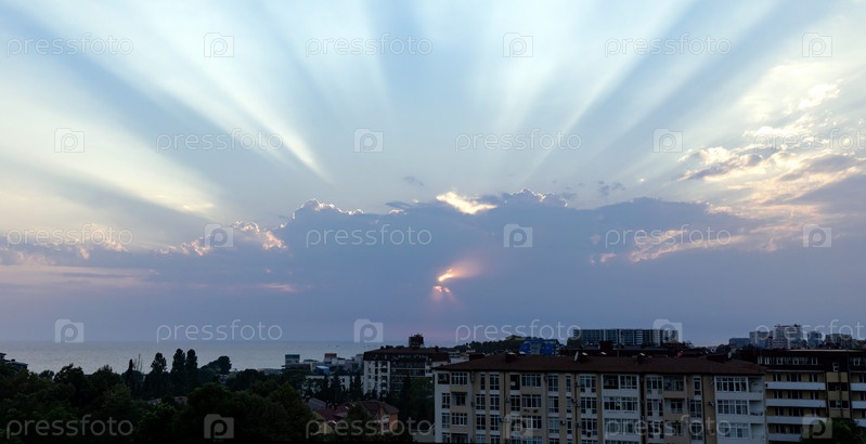 Красивые закатные облака с солнечными лучами по всему небу