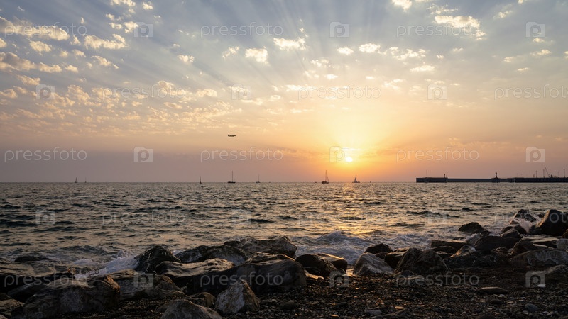 Красный закат в прибое на скалах и брызгах
