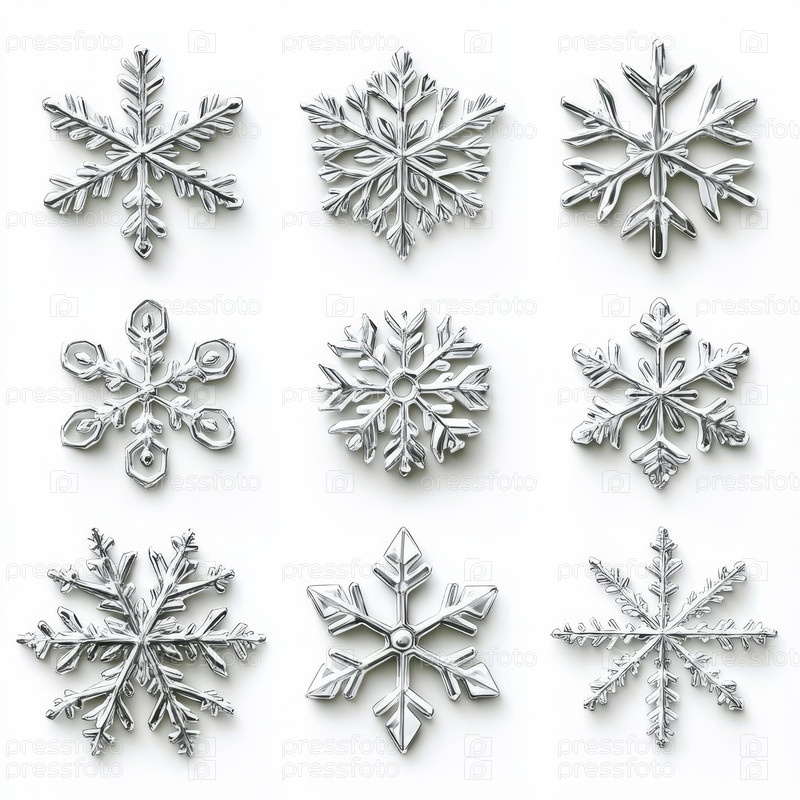 Уникальные снежинки в стильном серебристом металлическом дизайне на белом фоне. Новогодние украшения