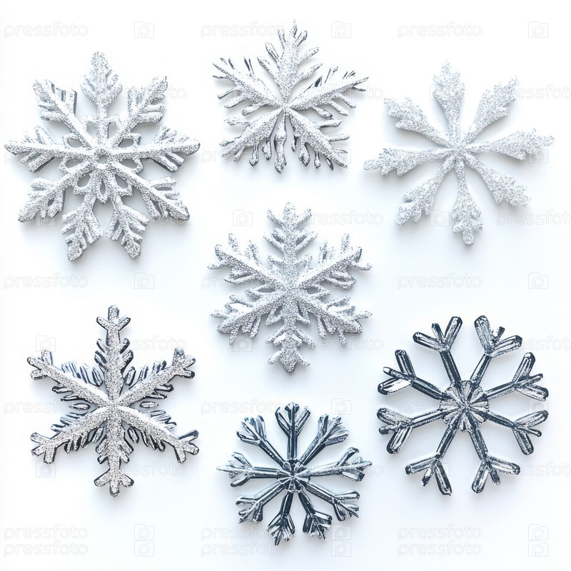 Уникальные снежинки в стильном серебристом металлическом дизайне на белом фоне. Новогодние украшения