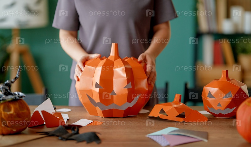 Женщина делает бумажные тыквы на Хэллоуин