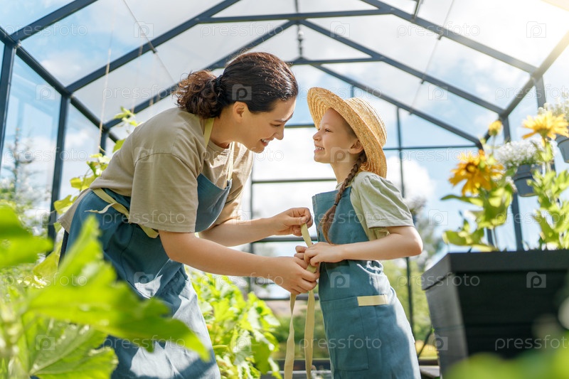 Мать и дочь занимаются садоводством в теплице