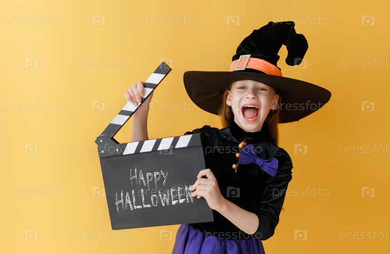 Девушка в костюме ведьмы на Хэллоуин на фоне желтой стены