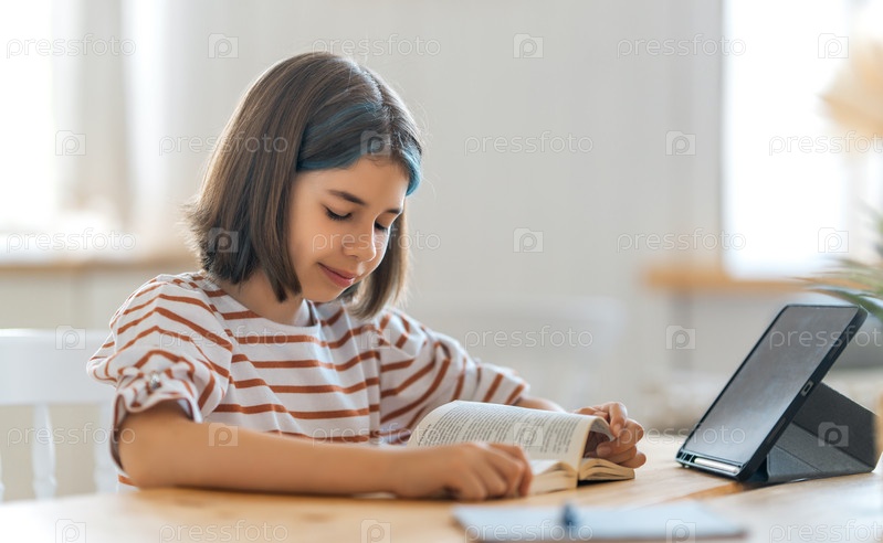 Девочка выполняет домашнее задание или обучается онлайн