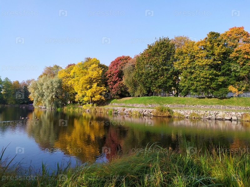 Осенний пейзаж с разноцветными деревьями и озером