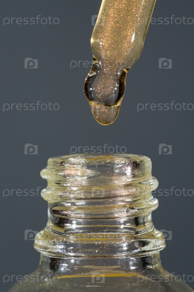 Прозрачная пипетка с косметической жидкостью на сером фоне. Эфирное масло капельница крупным планом
