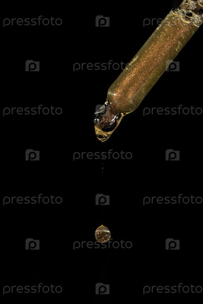 Золотая красота лица масло капает из золотой пипетки на черном фоне. Реклама косметики по уходу за кожей с копировальным пространством