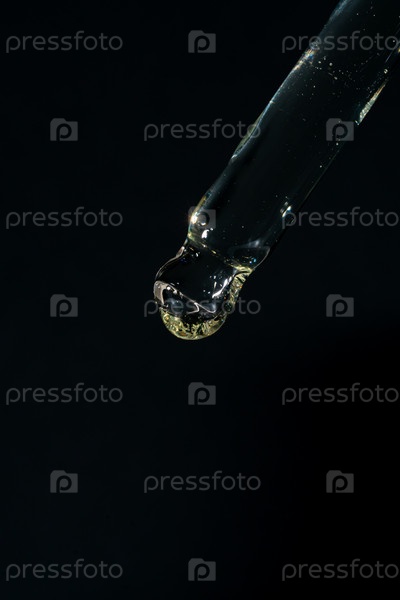 Пипетка-капельница для флакона крупным планом и жидкий ретинол или гель или сыворотка с витамином С на черном фоне