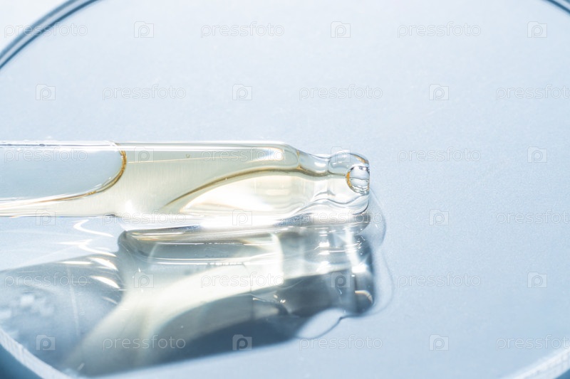 Бутылка пипетка капельница крупным планом и жидкий желто-оранжевый ретинол или витамин С гель или сыворотка на чашке Петри на синем фоне