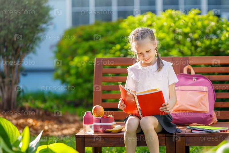 Девочка обедает сидя рядом со школой