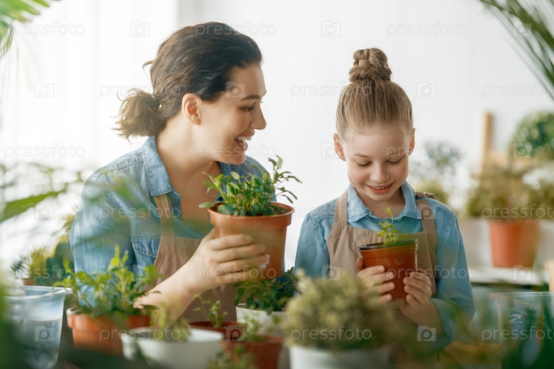 Семья ухаживает за растениями