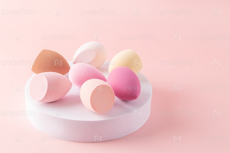 Несколько косметических спонжей в форме яйца, блендер для макияжа на круглом белом подиуме. розовый фон. инструменты для макияжа