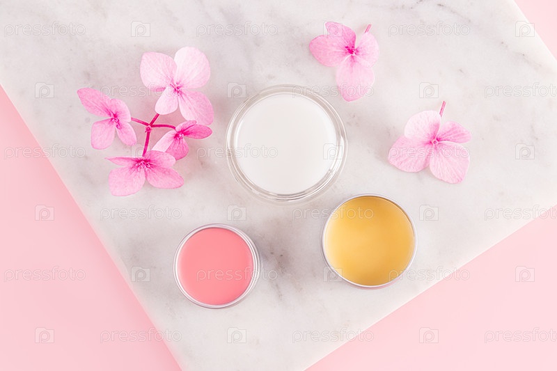 Три косметические баночки с натуральным бальзамом для губ разных цветов на мраморной подставке с розовыми цветами. вид сверху. Натуральный уход. Концепция ухода и красоты