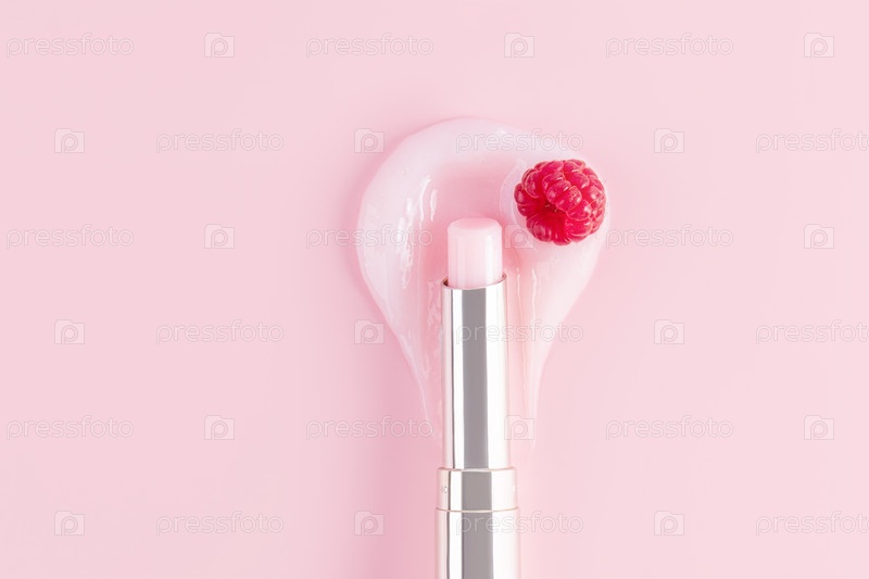 Открытая упаковка тюбика бальзама для губ с нежной структурой для увлажнения и питания губ лежит на образце розового бальзама. вертикальный вид сверху