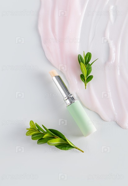 Натуральный бальзам в тюбике или гигиеническая помада для ухода за губами на образце текстуры жидкого бальзама. Уникальный органический витаминный комплекс. вид сверху. копировальное пространство