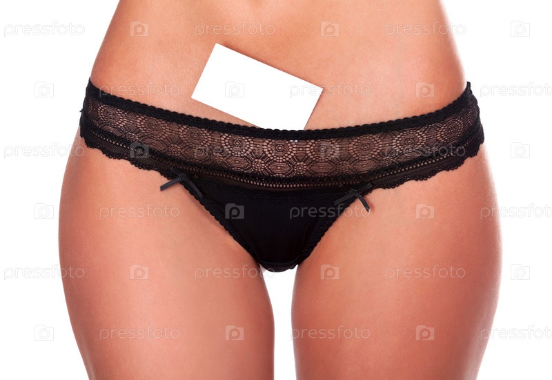 Черные трусики на женском теле и пустая белая карточка в нем, изолированная на белом фоне
