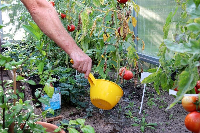 Мужчина поливает кусты томатов в теплице - мужская рука, крупный план