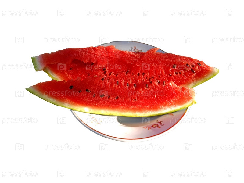 Ломтики спелого арбуза на тарелке - изолят