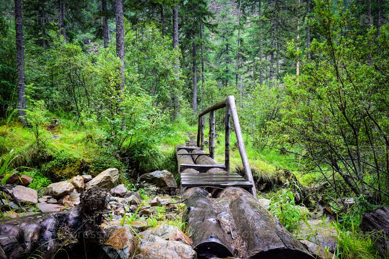 В тайге, мостик из бревен