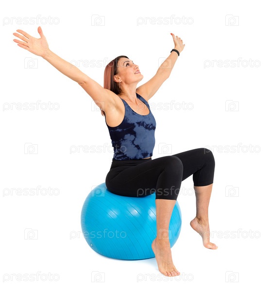 Красивая спортивная женщина делает упражнения на фитнес-мяче на белом фоне