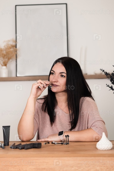 Задумчивая женщина с косметикой за минималистским столом