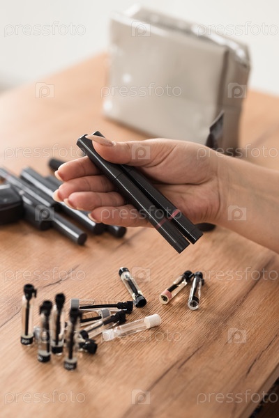 Женская рука держит косметику бальзам для губ и тушь для ресниц крупным планом вид сверху