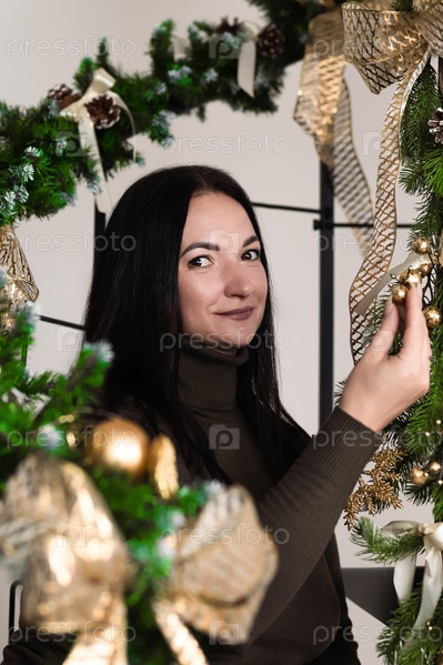 Женщина радостно и старательно украшает свой дом праздничными украшениями среди пышной зелени