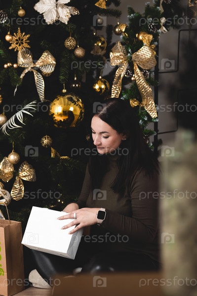 Женщина сидит возле елки и смотрит на подарки