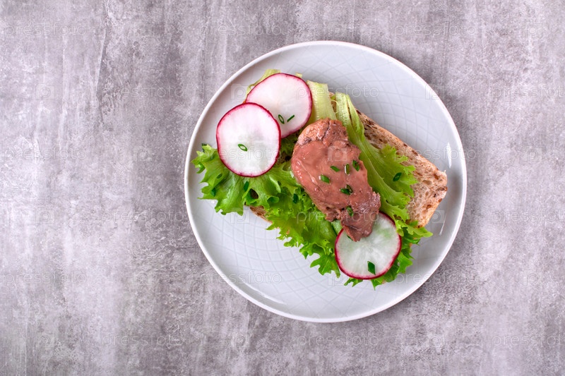 Печень трески подается на ломтике хлеба с листьями салата и редисом на белой тарелке на сером. Изысканная закуска. Вид сверху