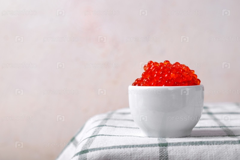 Красная икра подается в небольшой миске на белом фоне с местом для текста