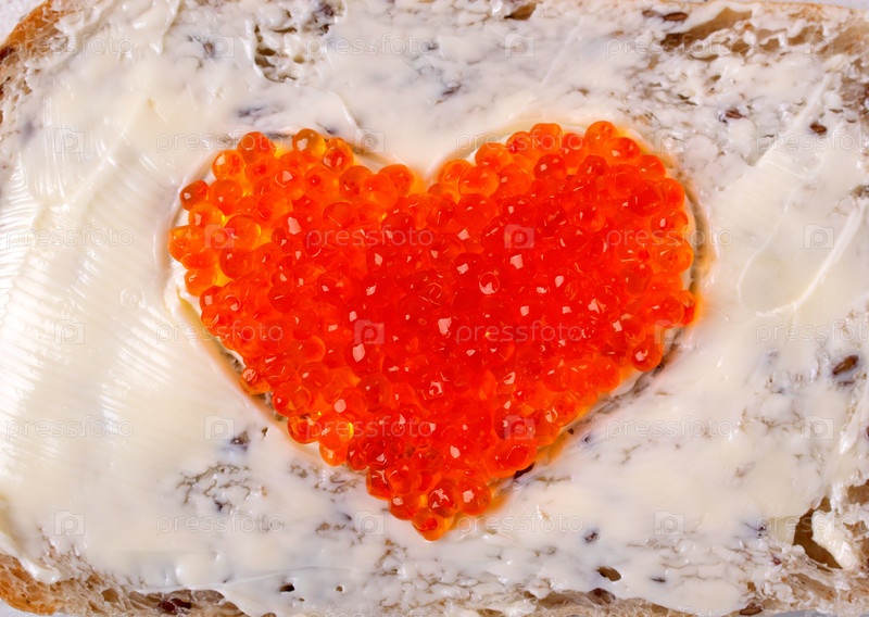 Красная икра, подается в форме сердца на сэндвиче со сливочным маслом