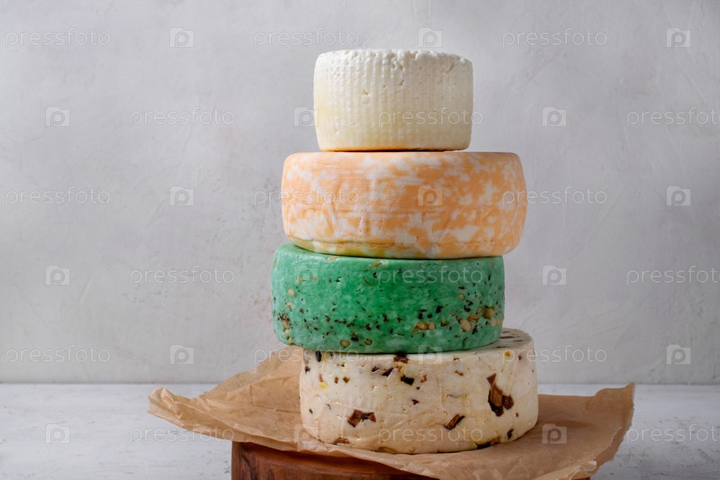 Ассорти сыров: качотта классическая, с грибами, зеленая с кедровыми орешками и мраморный сыр кесо фреско из коровьего молока. Набор вариаций полутвердых сыров