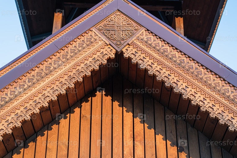 Фасад крыши здания обшит резным деревом