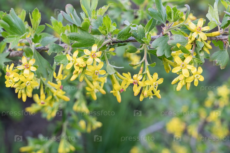 Цветущие ветки черной смородины в саду крупным планом