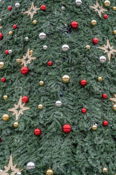 Яркая рождественская елка, украшенная разноцветными игрушками и звездами