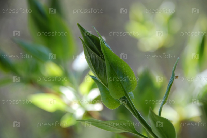 Еще не распустившиеся листья на ветке сирени