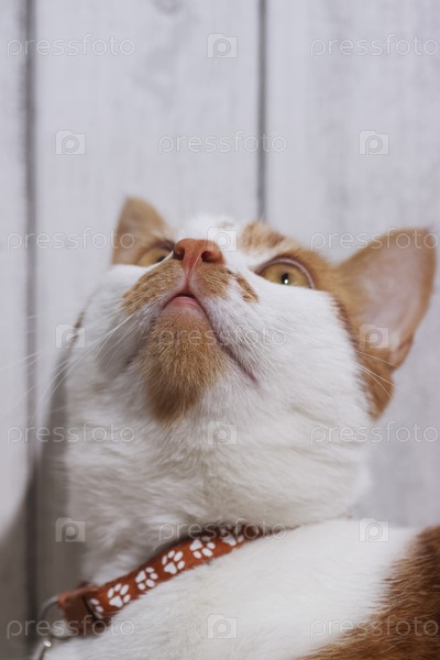 Рыже-белый кот осторожно смотрит вверх. Крупный план морды кота