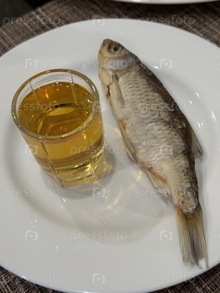 Рюмка с алкоголем и сушеная рыба на белой тарелке