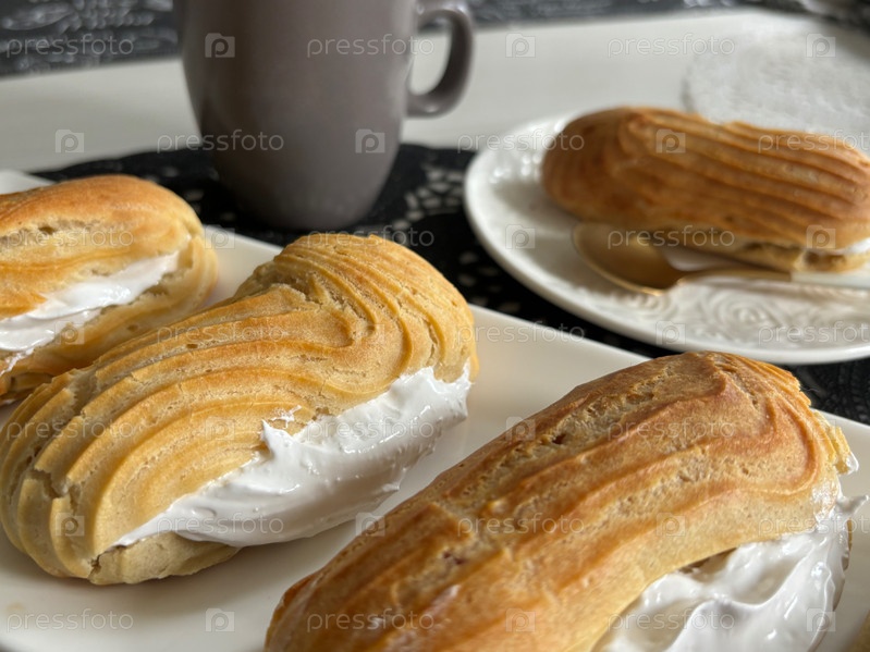 Домашние эклеры на тарелке. Чашка кофе рядом. Крупный план
