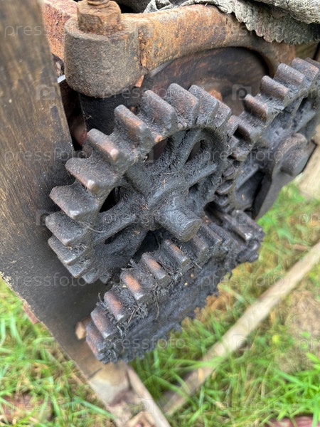 Механизм передачи ручного измельчителя кормов для животных. Шестерни старой соломорезки. Покрыты отработанным маслом и пылью