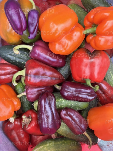 Смешанные овощи. Разноцветные и разнокалиберные перцы и огурцы. Крупный план
