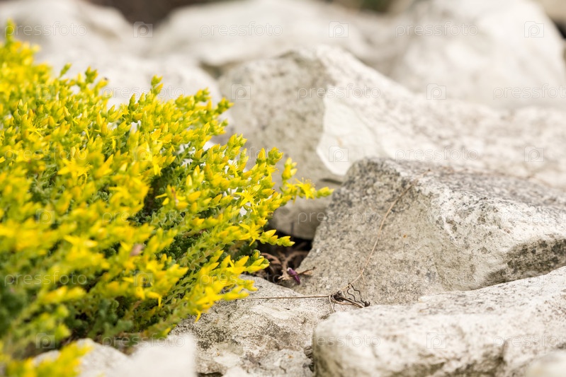 Цветущие желтые цветы на фоне известняковой травы