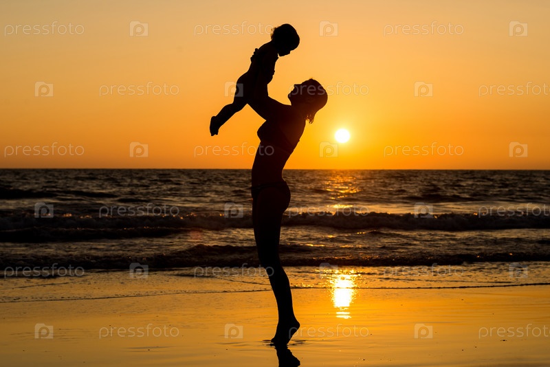 Мать с ребенком на руках на фоне моря на закате
